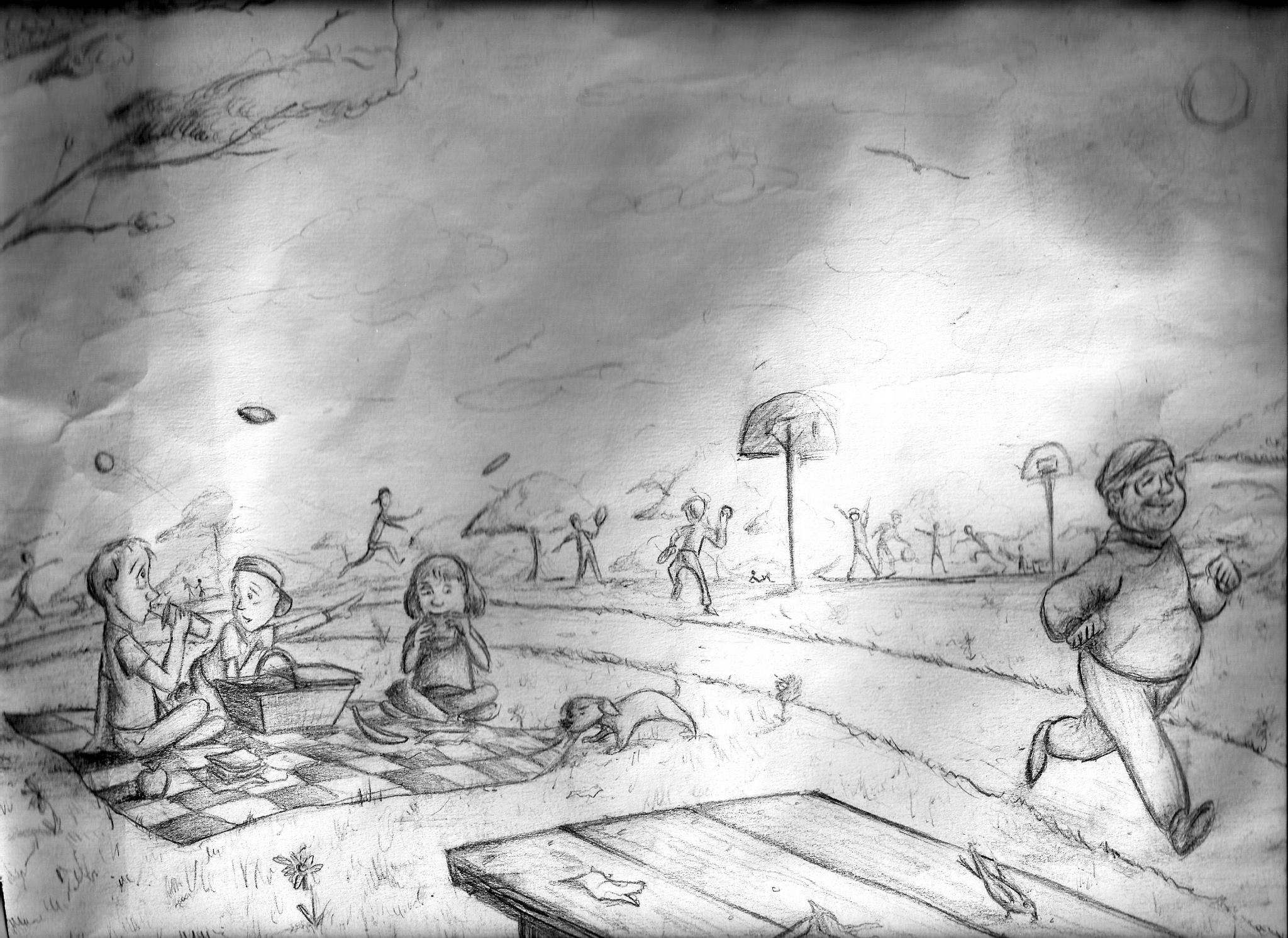 As you can see,  there are drawbacks to throwing artwork into a box for several years.  However, notice the detail she included in this drawing.  Yes, that is me on the jogging trail.  This is perhaps the only image of me ever jogging.